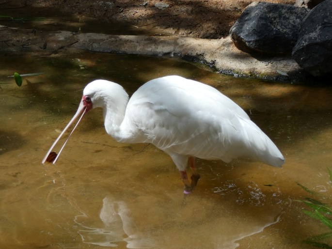 Popis: Bílý vodní pták s dlouhým lžicovitým zobákem, dosahuje délky 85–95 cm, rozpětí křídel 110–135 cm a hmotnosti 1,1–1,8 kg. Obličej je pokrytý holou červenou kůži. Duhovka oka je bělavá. Dlouhý lžicovitý zobák je šedý, u kořene a na hranách červený. Zbarvení peří dospělého jedince je bílé. Nohy jsou červené.